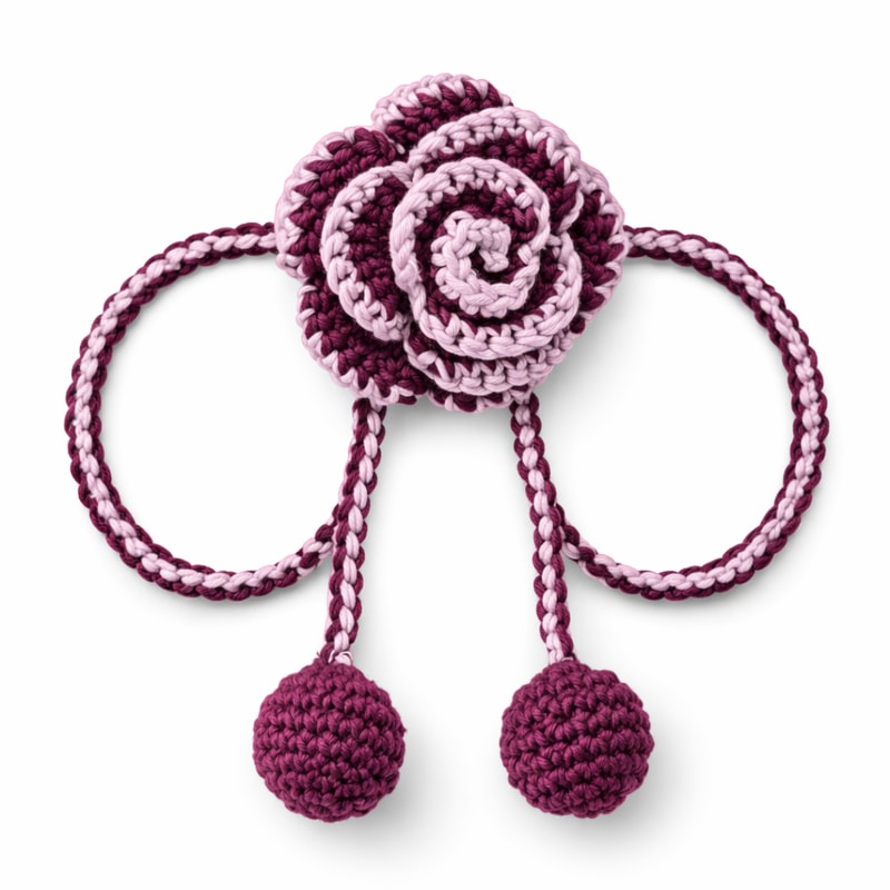 Handcrafted crochet rose curtain tiebacks with braided cords and pom-poms. Elegant, durable, and perfect to add a touch of charm to your living room or bedroom décor. Set of 2.