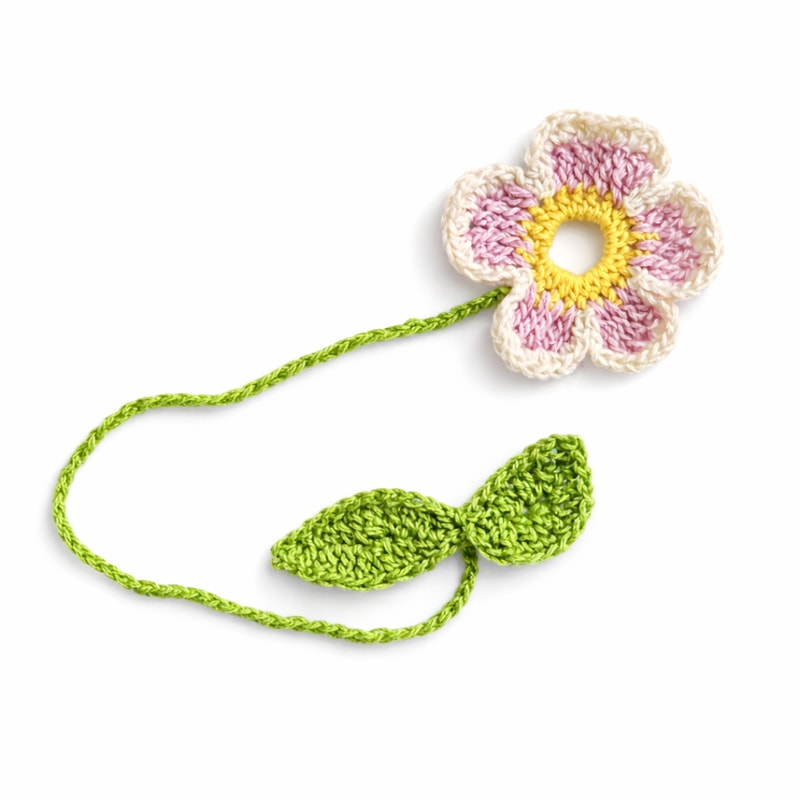 Add a decorative touch to everyday cable organization with the Bunaav Handmade Crochet Cable Tie. This single-piece cord organizer features a 5-petal flower on one end and a double-leaf motif on the other, connected by a slim green crocheted cord that wraps around coiled cables. Ideal for small electronics cords like charging cables, USB cords, and earbud wires, it keeps bundles neat in bags, drawers, and desk setups. Color details: bright green cord/leaves, pastel pink petals with cream edging, and a warm yellow stitched center ring.