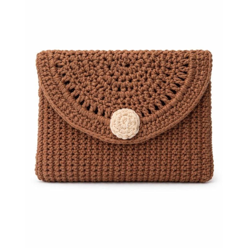Bunaav presents a handmade crocheted clutch in a warm brown tone with a contrasting cream crocheted button. The chunky, tightly stitched rectangular body is finished with a distinctive semicircular openwork flap on the front for an elegant artisan look. Strapless and free of visible logos or metal hardware, it’s a clean handheld option for weddings, parties, and evenings—ideal for carrying small essentials. A versatile, thoughtful gift for special occasions.